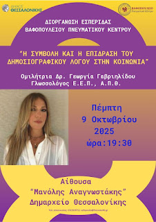Το Βαφοπούλειο Πνευματικό Κέντρο διοργανώνει την Πέμπτη 9 Οκτωβρίου 2025 εσπερίδα με τίτλο «Η συμβολή και η επίδραση του δημοσιογραφικού λόγου στην κοινωνία» , με ομιλήτρια την Δρ. Γεωργία Γαβριηλίδου, Γλωσσολόγο Ε.Ε.Π., Α.Π.Θ.