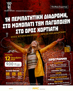 Η Αντιδημαρχία Πολιτισμού και Τουρισμού του Δήμου Πυλαίας – Χορτιάτη εγκαινιάζει μια νέα δράση εξωστρέφειας και πολιτισμού στον Χορτιάτη. H «1η Περιπατητική Διαδρομή στο Μονοπάτι των Παγοποιών», θα πραγματοποιηθεί την Κυριακή 12 Οκτωβρίου 2025, με ώρα έναρξης 9:00 π.μ., και απευθύνεται σε όλους όσοι θέλουν να συνδυάσουν άσκηση, γνώση και εμπειρία μέσα στη φύση, ανεξαρτήτου ηλικίας.